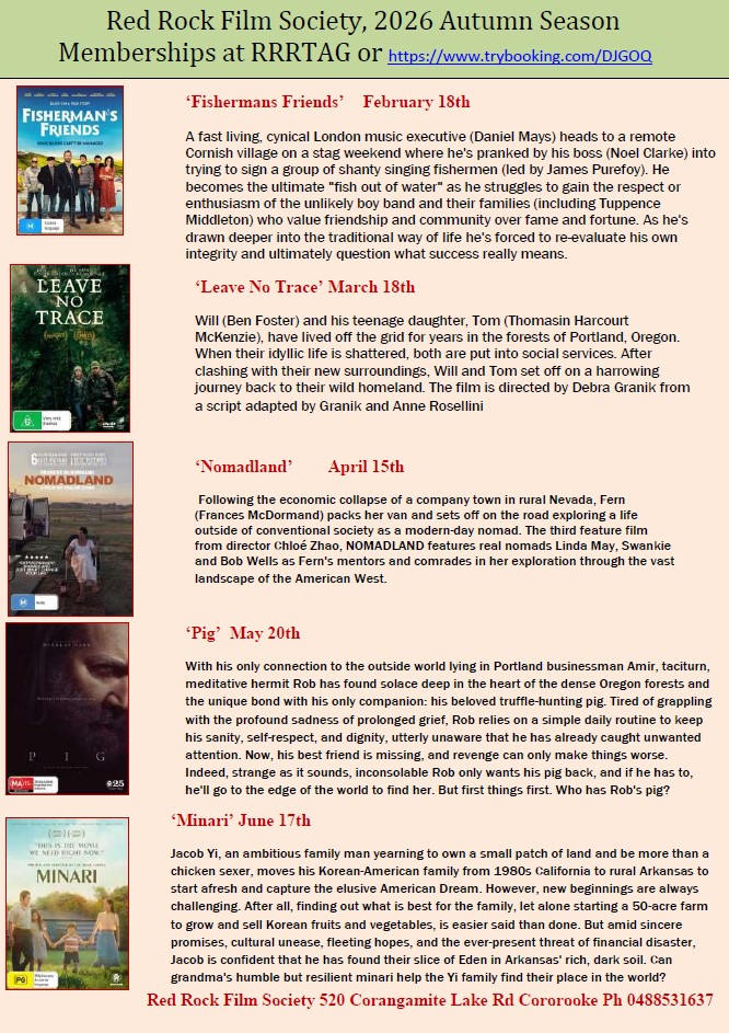 Coming to Red Rock Film Society in the FIRST HALF OF 2026 will be a new selection of thought provoking films from around the globe. We look forward to catching up with our Film Society members past and recent.